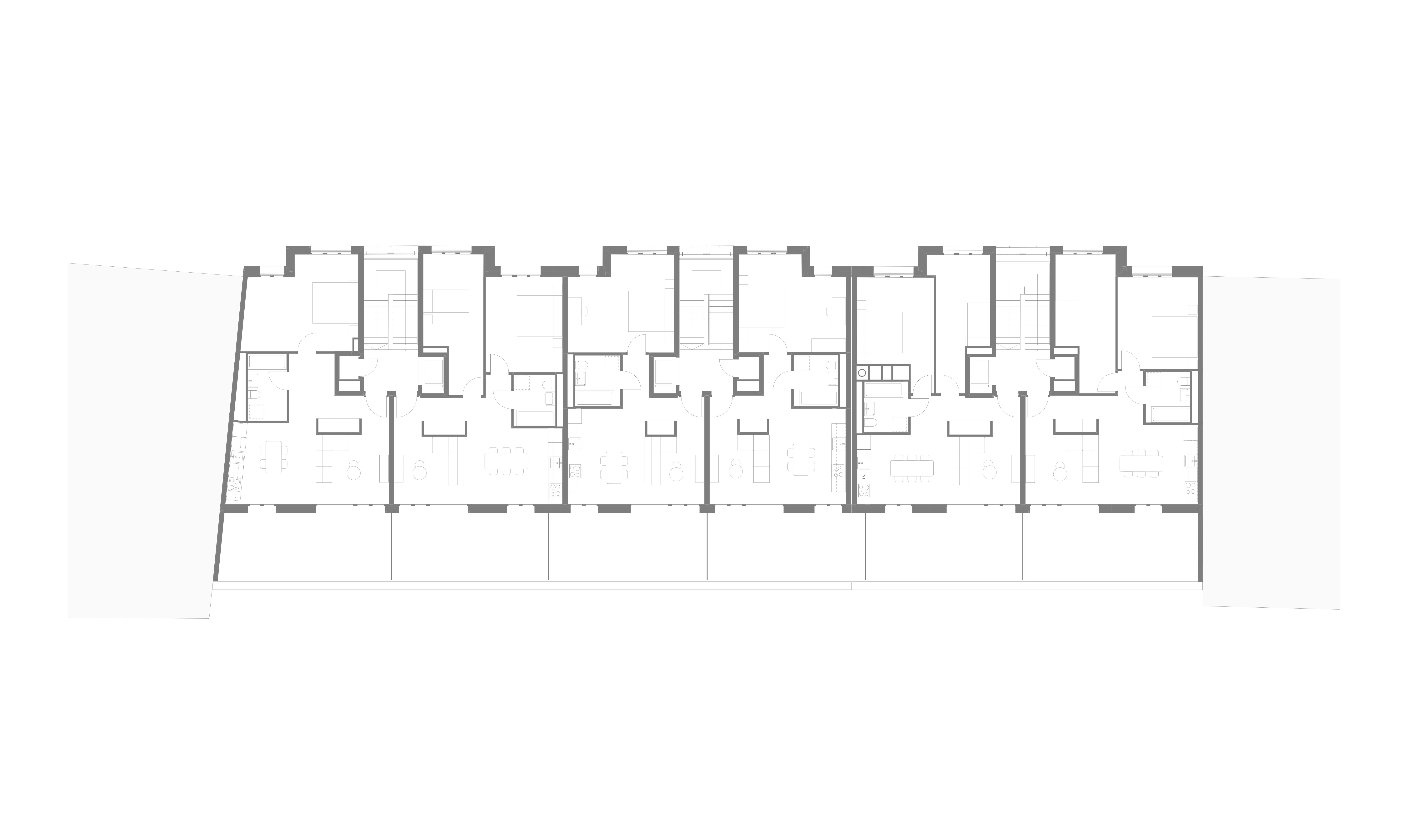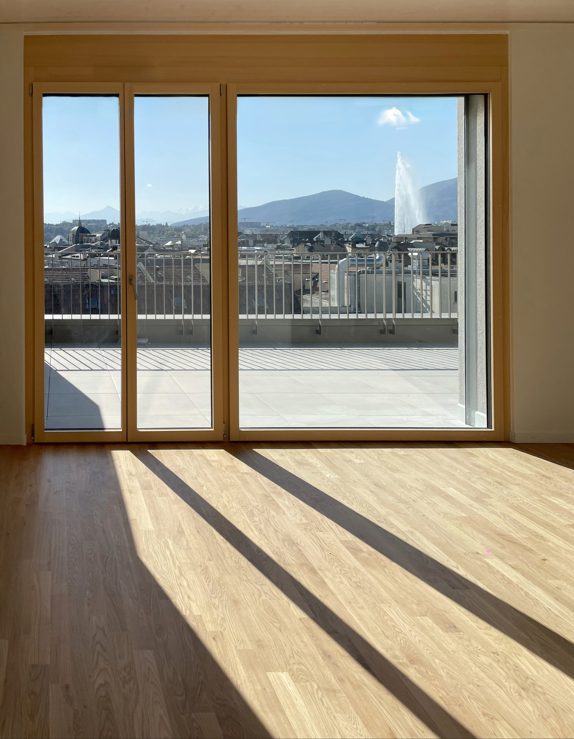 Ces logements traversants bénéficient de loggias orientées à l’est, offrant des vues sur le Jet d’eau et le Salève. Les deux étages supplémentaires ont été conçus dans la continuité du bâti existant.