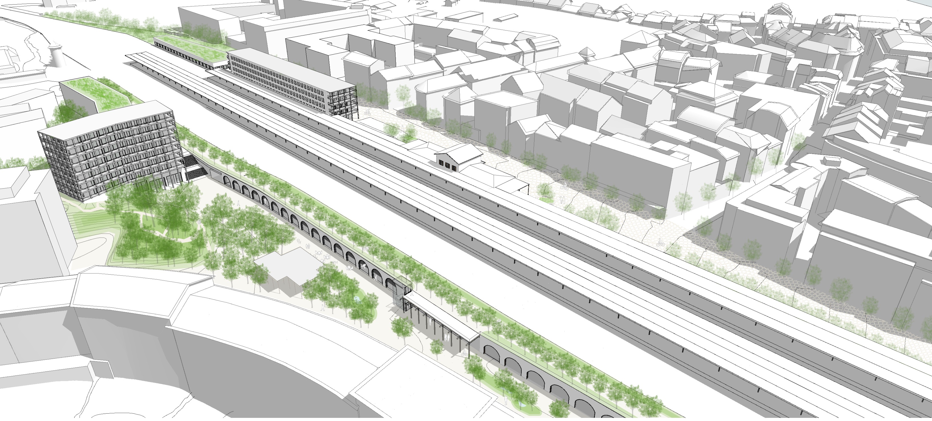 Au cœur du projet, la promenade plantée et les arcades constituent le marqueur identitaire du futur quartier de la gare, où les mobilités se croisent dans des espaces fonctionnels et qualitatifs.