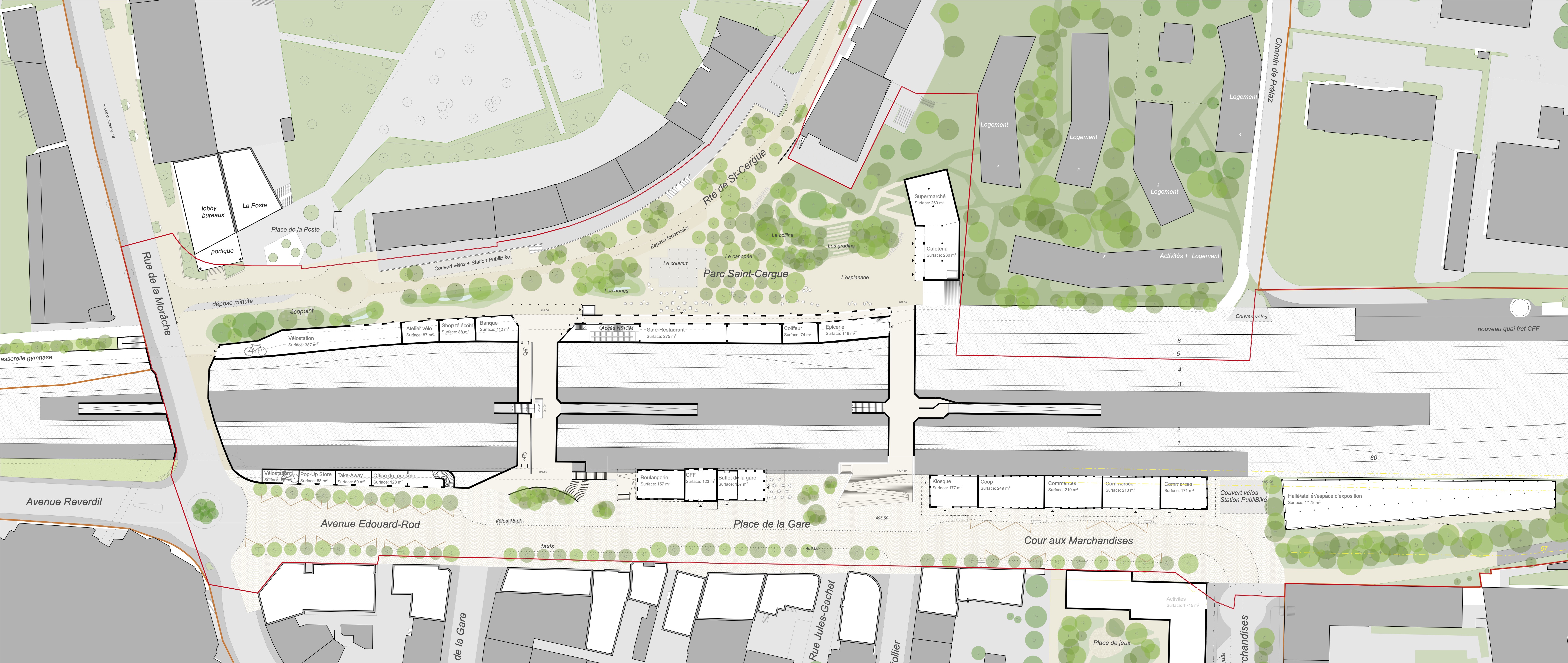 Parc Saint-Cergue : Côté Nord, le futur passage Viollier s'ouvre sur un parc généreux, cadré entre les deux passages inférieurs et un bâtiment emblématique faisant transition avec le quartier du Martinet. Le parc se compose de plusieurs séquences : une colline préservant la topographie, une esplanade pour manifestations éphémères, des noues de rétention d'eau et une zone de canopée. Une promenade plantée en surplomb relie l'est à l'ouest, du Gymnase de Nyon au chemin de Prélaz.