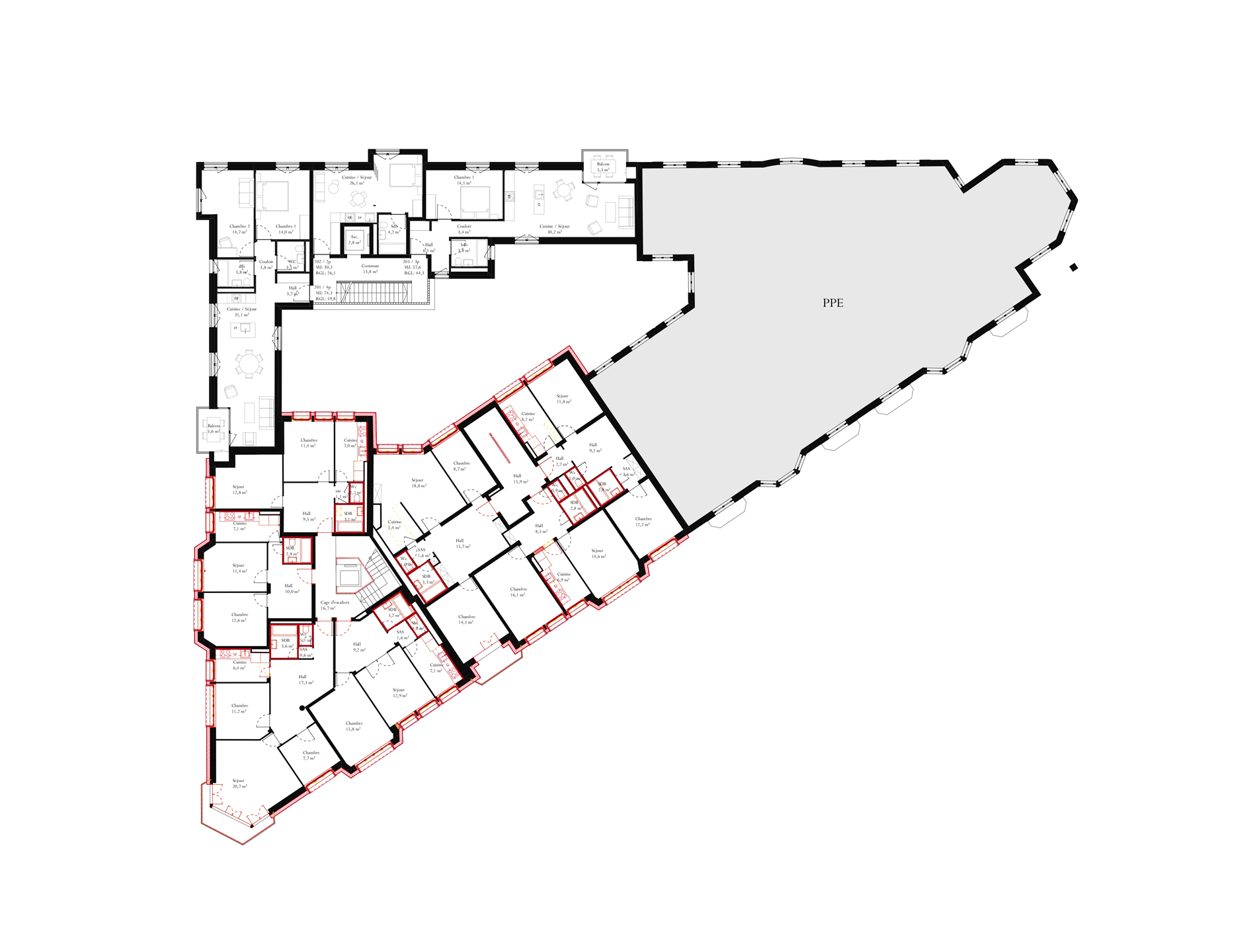 Le concours porte sur l'assainissement total du bâtiment existant et la transformation des combles, et propose d'optimiser l'exploitation du bien par la densification de l'ilôt. Pour répondre à ces besoins, deux variantes de projet sont proposées, au delà de la rénovation et transformation du bâtiment rue des Pénates.